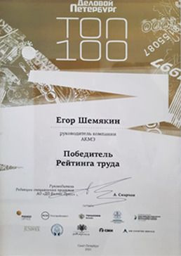 «Деловой Петербург» вручил награду в рейтинге «Топ-100» Руководителю компании Шемякину Е.А. в номинации
